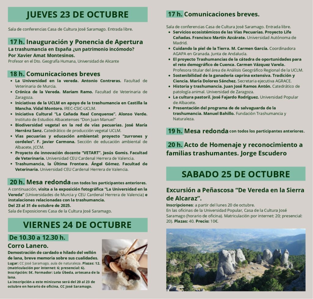 Las jornadas comenzarán el jueves 23 de octubre con varias ponencias, el día 24 , continuará con una demostración práctica de cardado e hilado de vellón y finalizará el día 25 con una excursión a Peñascosa titulada ” de Vereda en la Sierra de Alcaraz”.